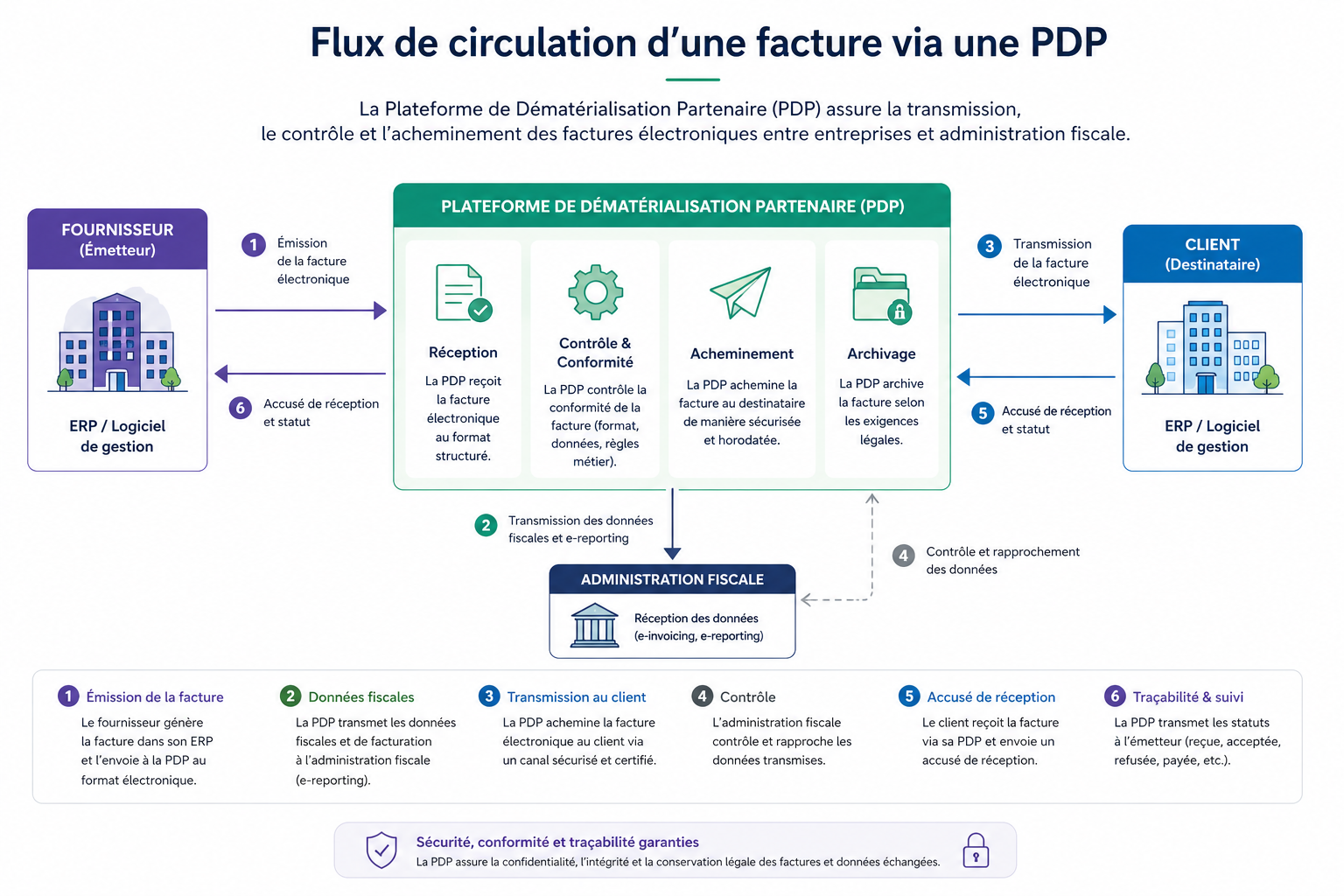 Les PDP sont des plateformes certifiées par l’État qui assurent la transmission sécurisée des factures électroniques entre entreprises et administration fiscale.