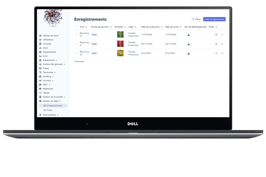 Organisation complète du label : catalogue, droits, ayants-droits, sorties et suivi des projets artistiques. Centralise toutes les informations pour une vision claire et stratégique de ton activité musicale.